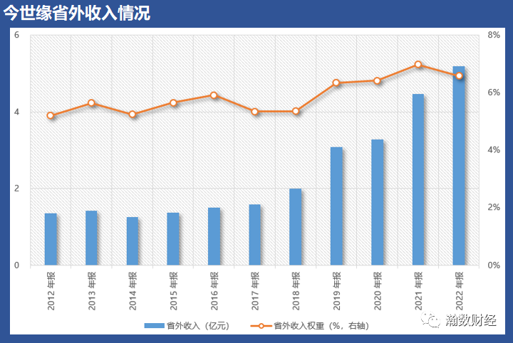 今世缘近5年省外收入年复合增速虽然达到26.85%,但其2022年省外收入只有5.19亿元,占公司收入比仅6.58%,且回望过去10年,今世缘省外收入占比最高也只不过是2021年的6.98%。
