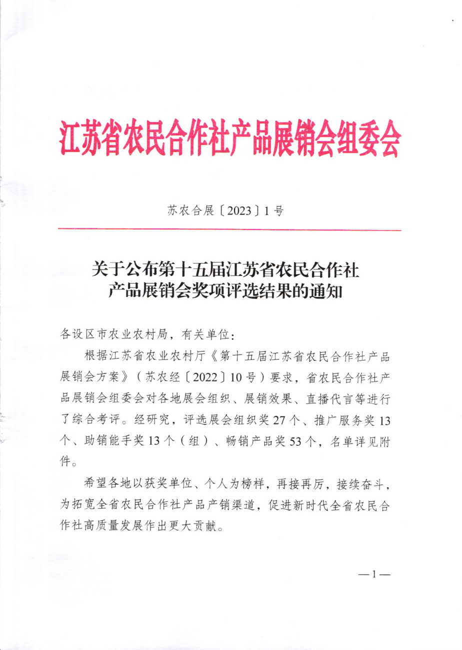 根据江苏省农业农村厅 《第十五届江苏省农民合作社产品展销会方案》 (苏农经〔2022〕10号 )要 求,省农民合作社产品展销会组委会对各地展会组织、展销效果、直播代言等进行了综合考评。