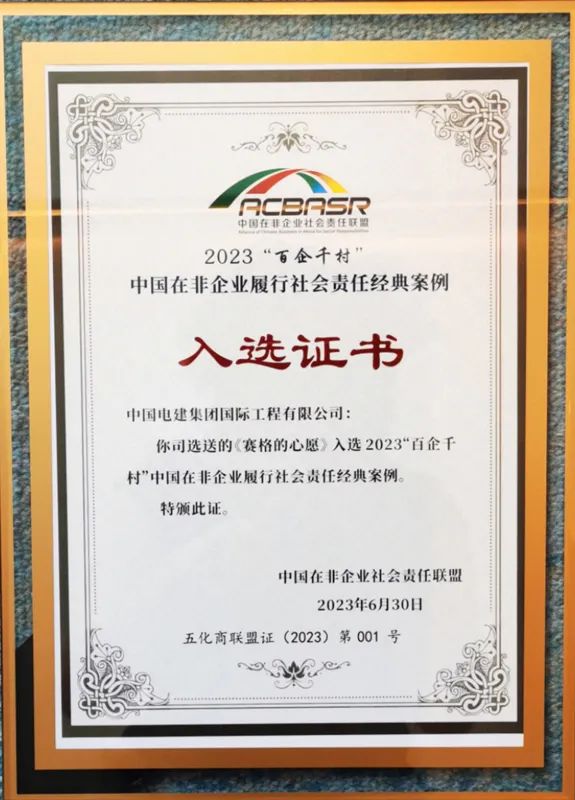 陈观福同中国在非企业社会责任联盟执行主席刁春和等中非双边重要嘉宾共同上台,发布“落实百企千村,厚植中非友谊”——《中国在非企业履行社会责任共同行动倡议》,共同呼吁在非企业积极践行使命担当,努力融入非洲发展,推动发展成果共享,与非洲人民及国际各方共绘非洲永续发展蓝图。活动还发布了《2023“百企千村”中国在非企业履行社会责任经典案例》,公司选送的《赛格的心愿》案例入选。