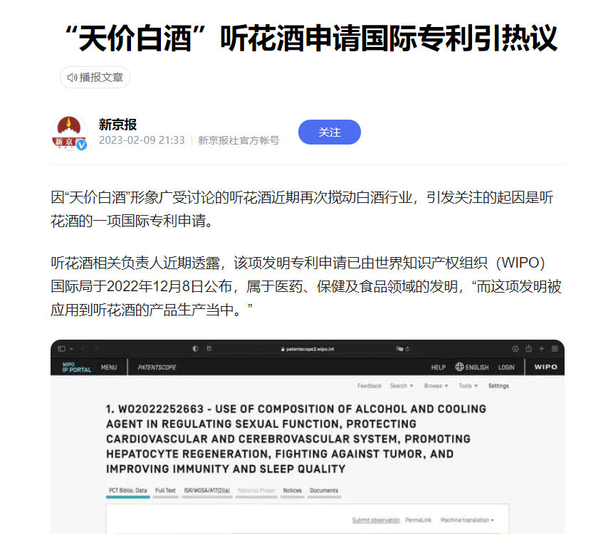 “听花酒就是白酒里的理科生,当别的酒在那里吟诗作赋,听花酒就在搞研发搞试验”,与财经博主周咬金的评价有异曲同工之妙的是,听花酒还被誉为“科学家酿造的价值”。据悉,听花酒目前已获得国家发明专利3项,正在审核的发明专利3项,前不久听花酒的一项国际专利申请,被世界知识产权组织公布一事也登上了热搜。