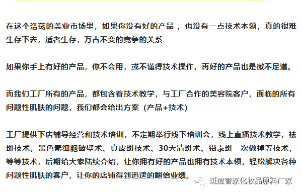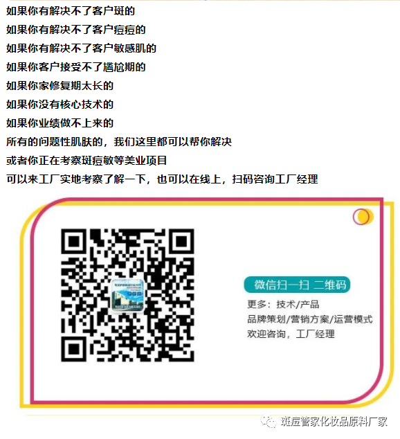 斑痘管家化妆品原料厂家,集研发生产,销售、营销策划,技术培训,于一体的企业,专注面部问题性肌肤:祛斑、祛痘、美白、激素脸,敏感修护,院线产品,经过十余年的潜心研发和突破,产品目前的技术和品质处于行业靠前的水平,已获得多项荣誉及资质,工厂拥有3000+配方,以及10000+现货产品,热销全国各地,合作美容院店铺5000+,工厂合作的美容院,提供技术培训,下店指导营销,欢迎咨询