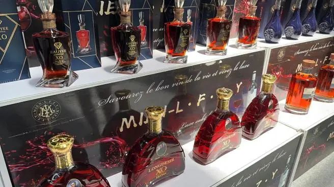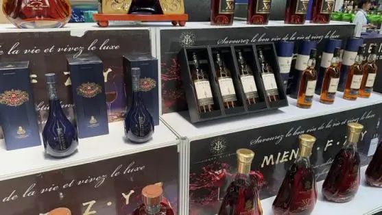 在TEANINICH展台,法国白兰地、英国威士忌、法国白葡萄酒等酒类丰富。法国白兰地是一种以葡萄为原料,经过蒸馏后再陈放的烈酒。