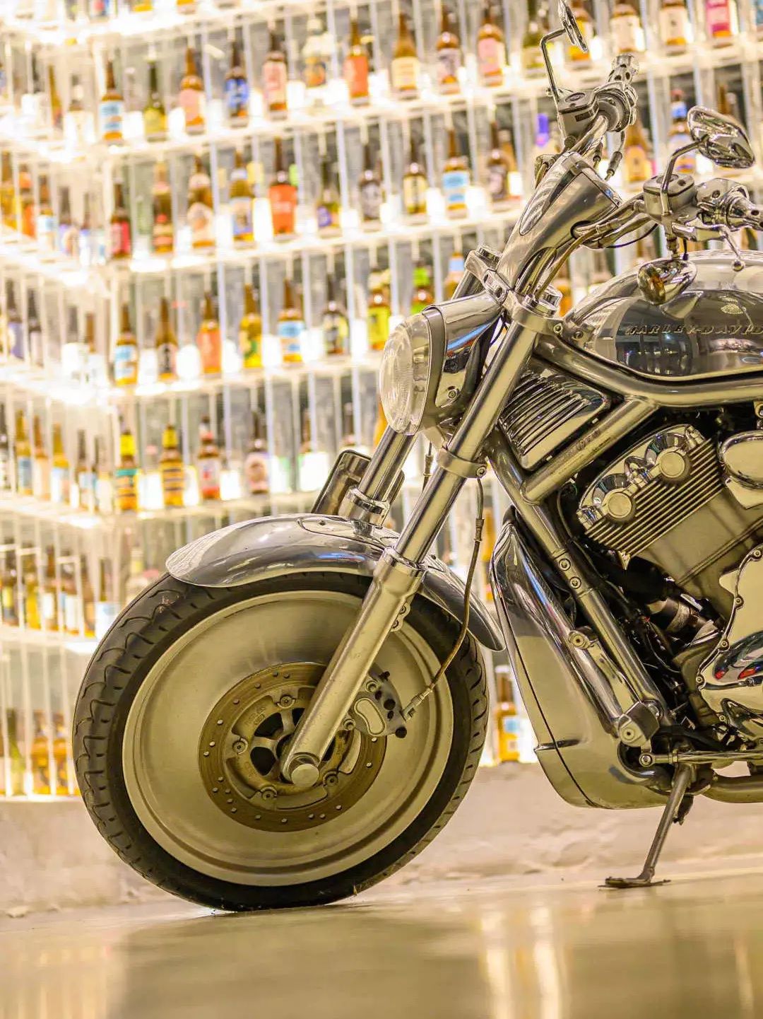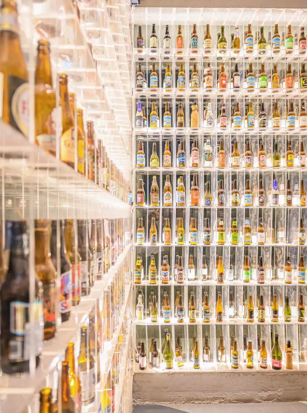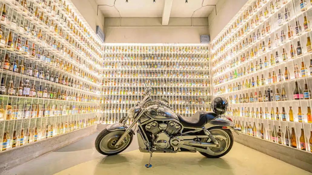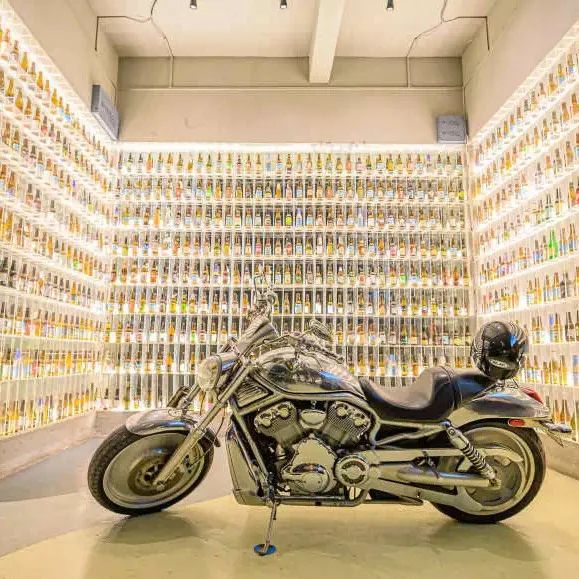 一进门,你就会被这里的陈设深深地吸引,三面环形的精酿啤酒墙,中间摆放着一台据说造价28万的哈雷摩托,出片率100%。当然,店内主打的依然是精酿啤酒,足足1300款来自30个国家以上的精酿,用10米长的酒柜才装得下所有啤酒。