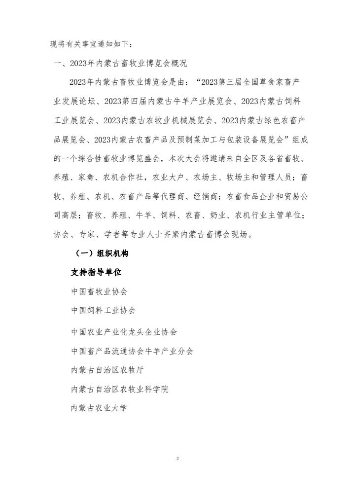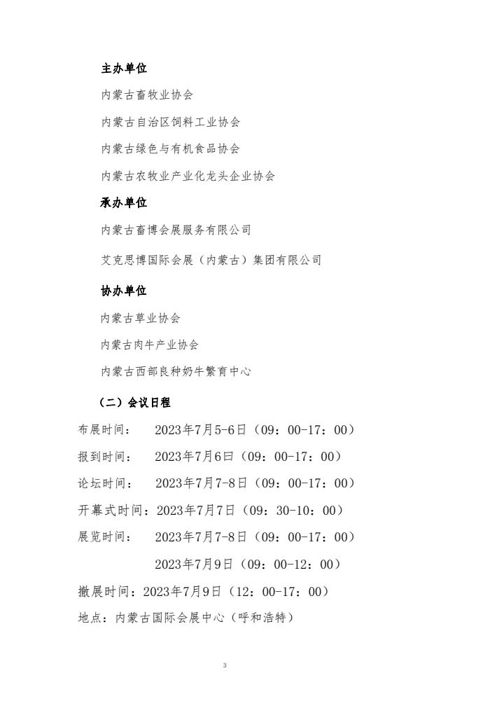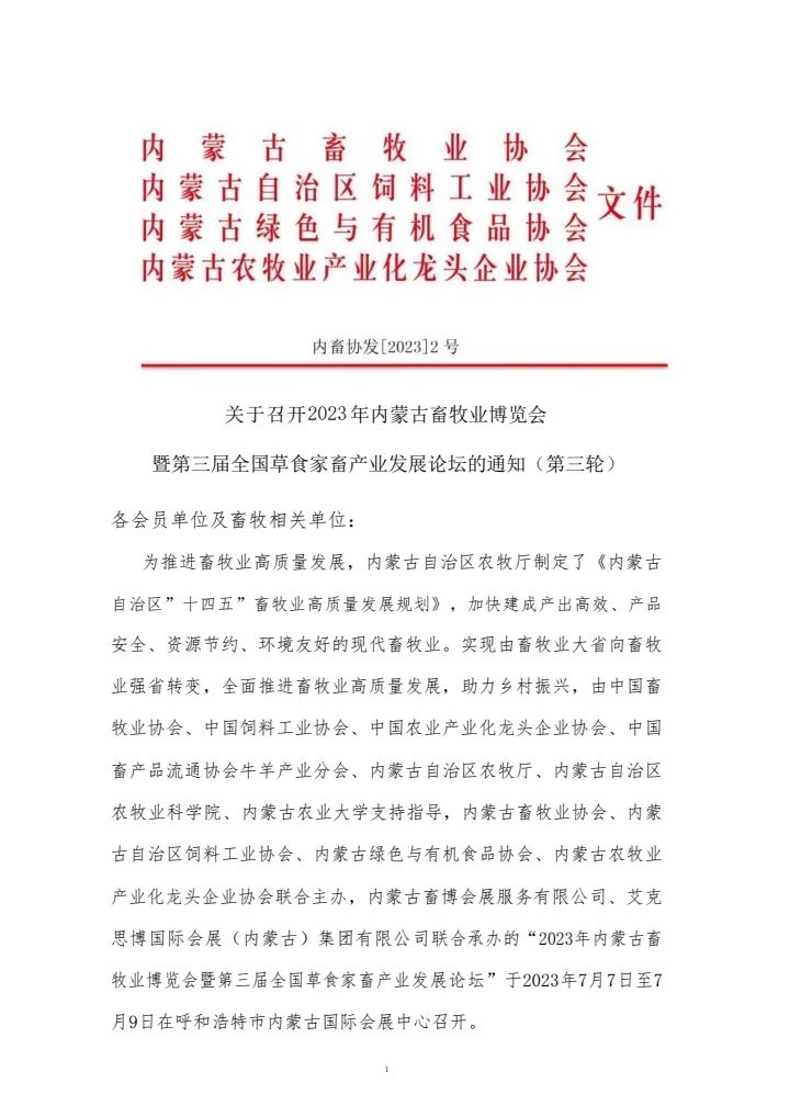为推进畜牧业高质量发展,内蒙古自治区农牧厅制定了《内蒙古自治区”十四五”畜牧业高质量发展规划》,加快建成产出高效、产品安全、资源节约、环境友好的现代畜牧业。实现由畜牧业大省向畜牧业强省转变,全面推进畜牧业高质量发展,助力乡村振兴,由中国畜牧业协会、中国饲料工业协会、中国农业产业化龙头企业协会、中国畜产品流通协会牛羊产业分会、内蒙古自治区农牧厅、内蒙古自治区农牧业科学院、内蒙古农业大学支持指导,内蒙古畜牧业协会、内蒙古自治区饲料工业协会、内蒙古绿色与有机食品协会、内蒙古农牧业产业化龙头企业协会联合主办,内蒙古畜博会展服务有限公司、艾克思博国际会展(内蒙古)集团有限公司联合承办的“2023年内蒙古畜牧业博览会暨第三届全国草食家畜产业发展论坛”于2023年7月7日至7月9日在呼和浩特市内蒙古国际会展中心召开。