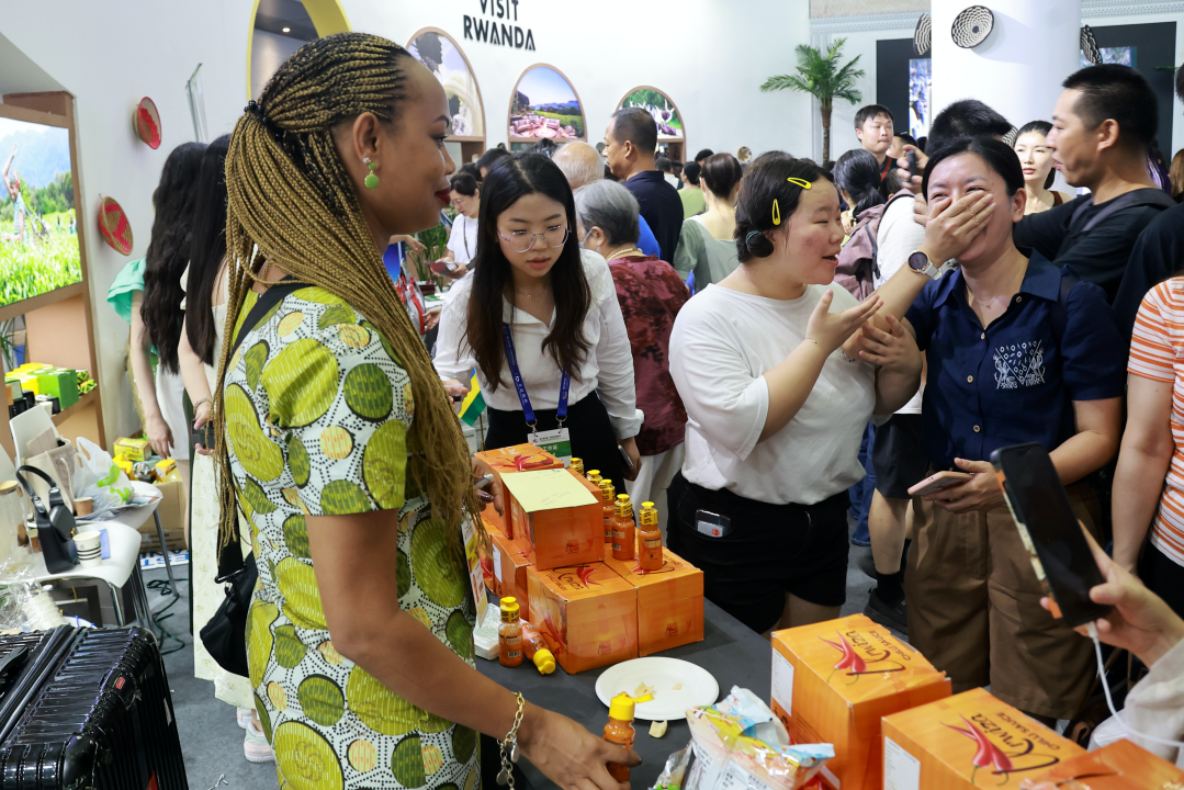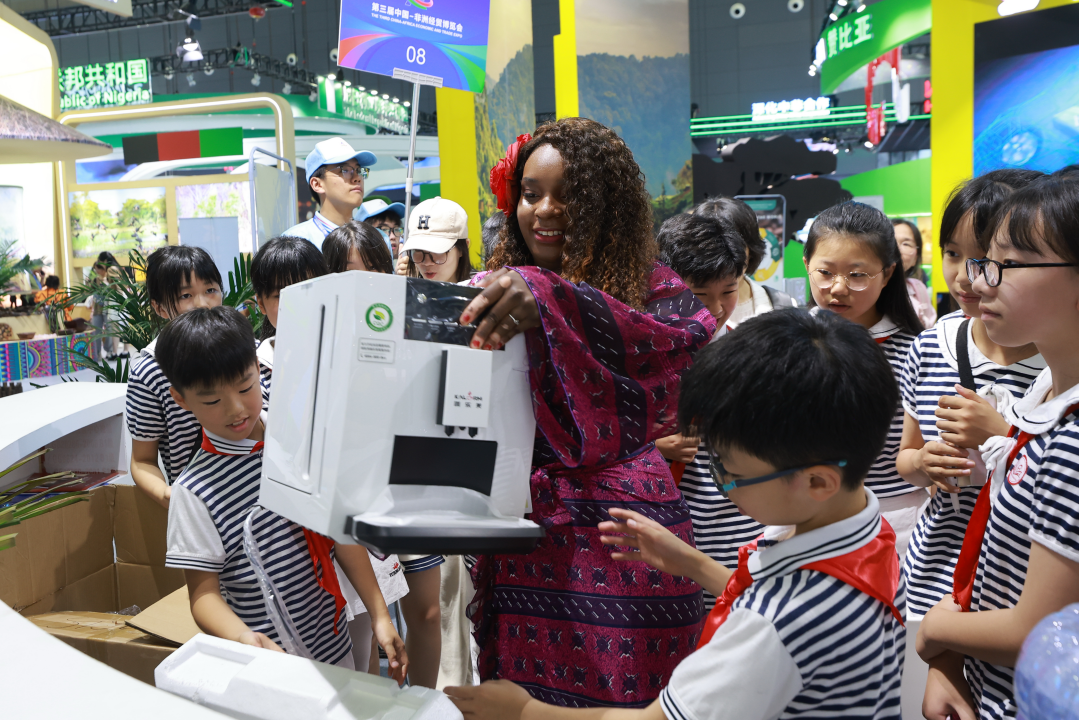 博览会上,来自刚果民主共和国的参展商打开了一台崭新的中国品牌咖啡机,她准备用这台咖啡机冲泡本国产的咖啡。此举引来一群小学生驻足观看。