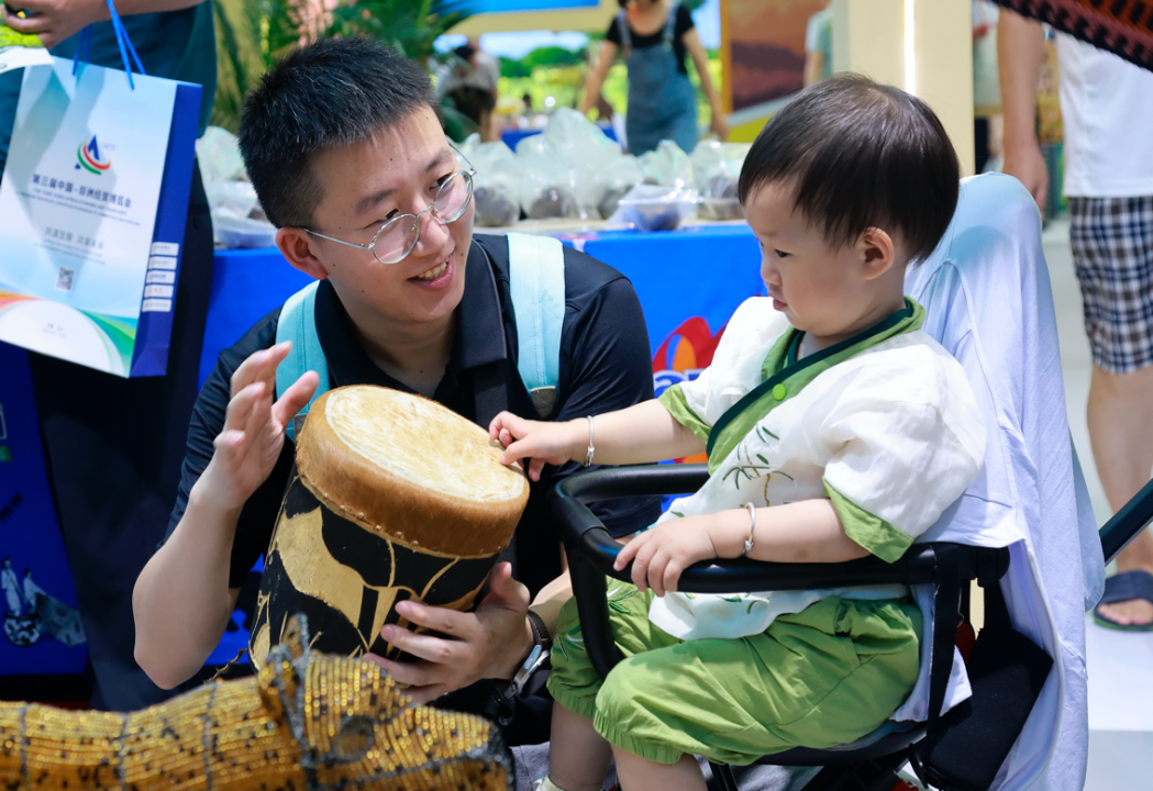 第三届中非博览会上,各国参展商都带来了本国特色产品。马拉维共和国展台上,一位父亲正拿起一只精美的手鼓与儿子互动。