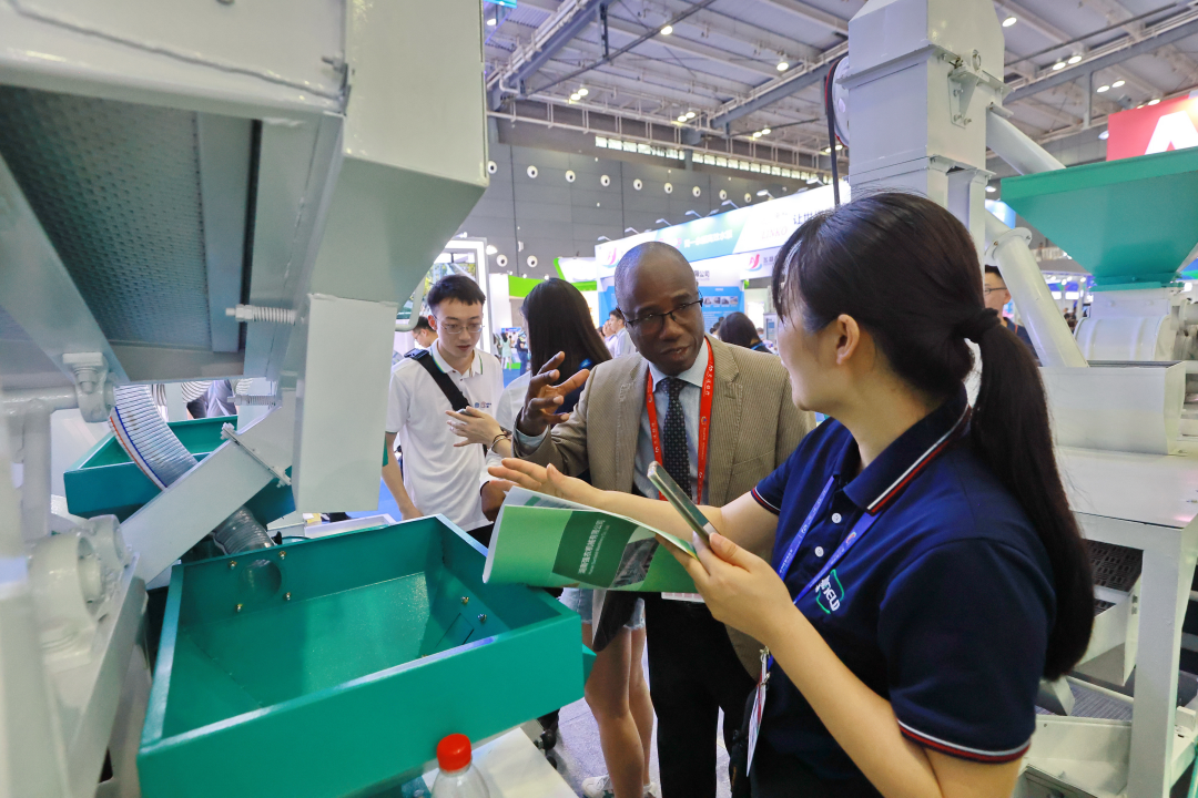 这里不仅有非洲客商的“看家宝”,还有中国参展商的“好物”。一名非洲来宾正在湖南强家机械有限公司展位前了解砻碾组合米机。