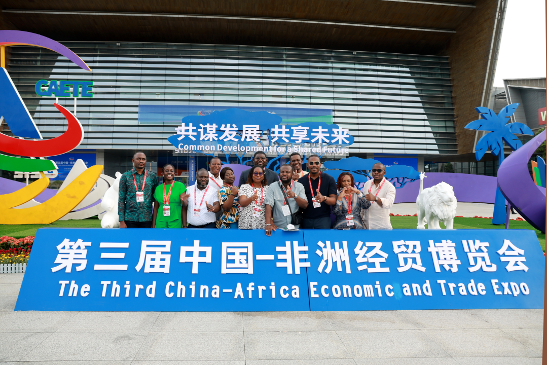 来自非洲的友人们在展馆前合影留念,共同期待中非合作的美好未来。