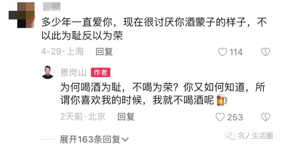 他自己都说“持续作战能力”较强,一年365天,有360天在喝酒,另外5天属于特殊,比如第二天要体检什么的,不能喝。360天中每日不醉,还有点意犹未尽,300天都是喝蒙圈的。景岗山一聊起酒就洋洋得意,有粉丝看不下去了:“不知为耻,反以为荣?”,以前很爱你,现在很讨厌你酒蒙子的样子。