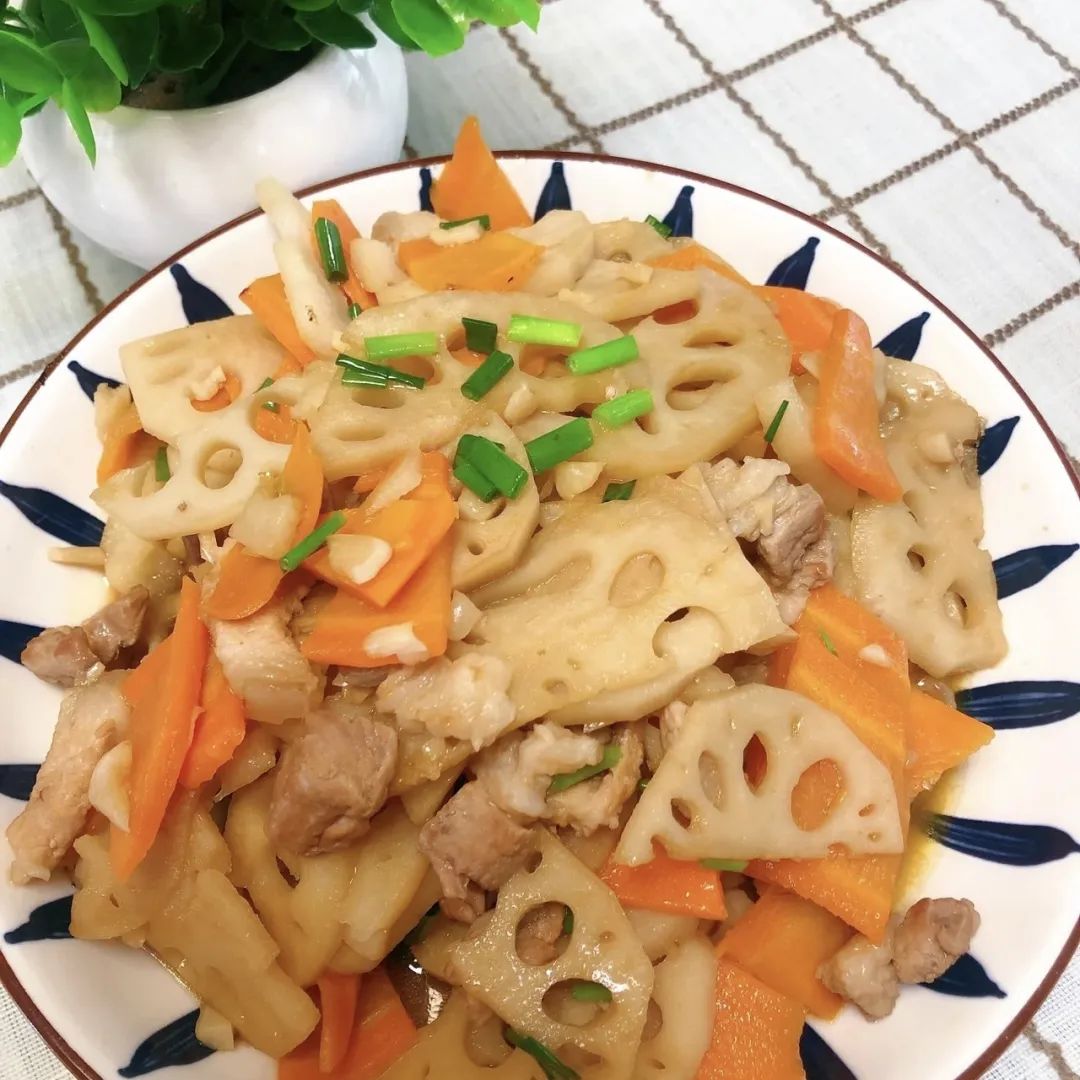 藕片炒肉:猪肉19g、藕37g、胡萝卜2g