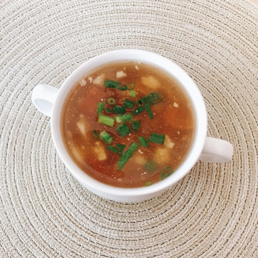 开胃羹:番茄10g、豆腐2g、香菇2g、火腿2g、鸡蛋5g
