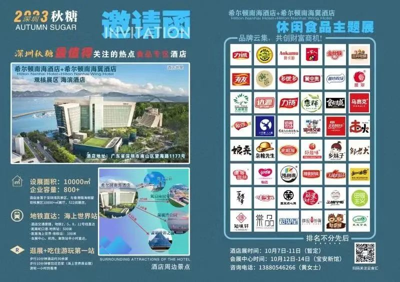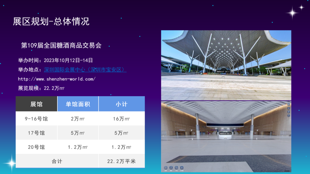 109届全国糖酒商品交易会举办时间:2023年10月12日-14日。展馆设置:使用展馆为9号馆-20号馆;9号、11号馆为休闲食品及烘焙,10号、12号为葡萄酒及国际烈酒,13号馆为饮品及乳制品,15号馆为调味品及配料,14号、16号馆为传统酒类,17号馆为包装及供应链、食品机械,18号馆开幕式及论坛,20号馆为大湾区乐慧潮食。
