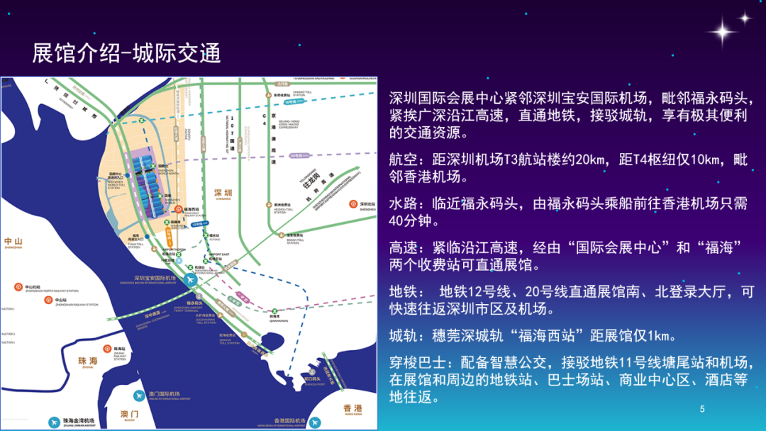 航空:深圳国际会展中心距深圳机场T3航站楼7公里,您可选择搭乘出租车或机场接驳线直达展馆。