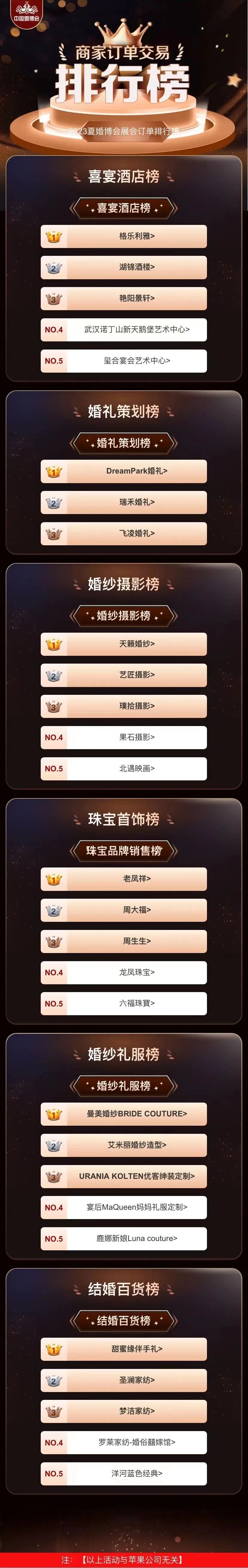 中国婚博会夏季展武汉站第一天总成交额达1.25亿元!格乐利雅、湖锦酒楼、艳阳景轩、DreamPark婚礼、瑞禾婚礼等多家商家位列榜单。