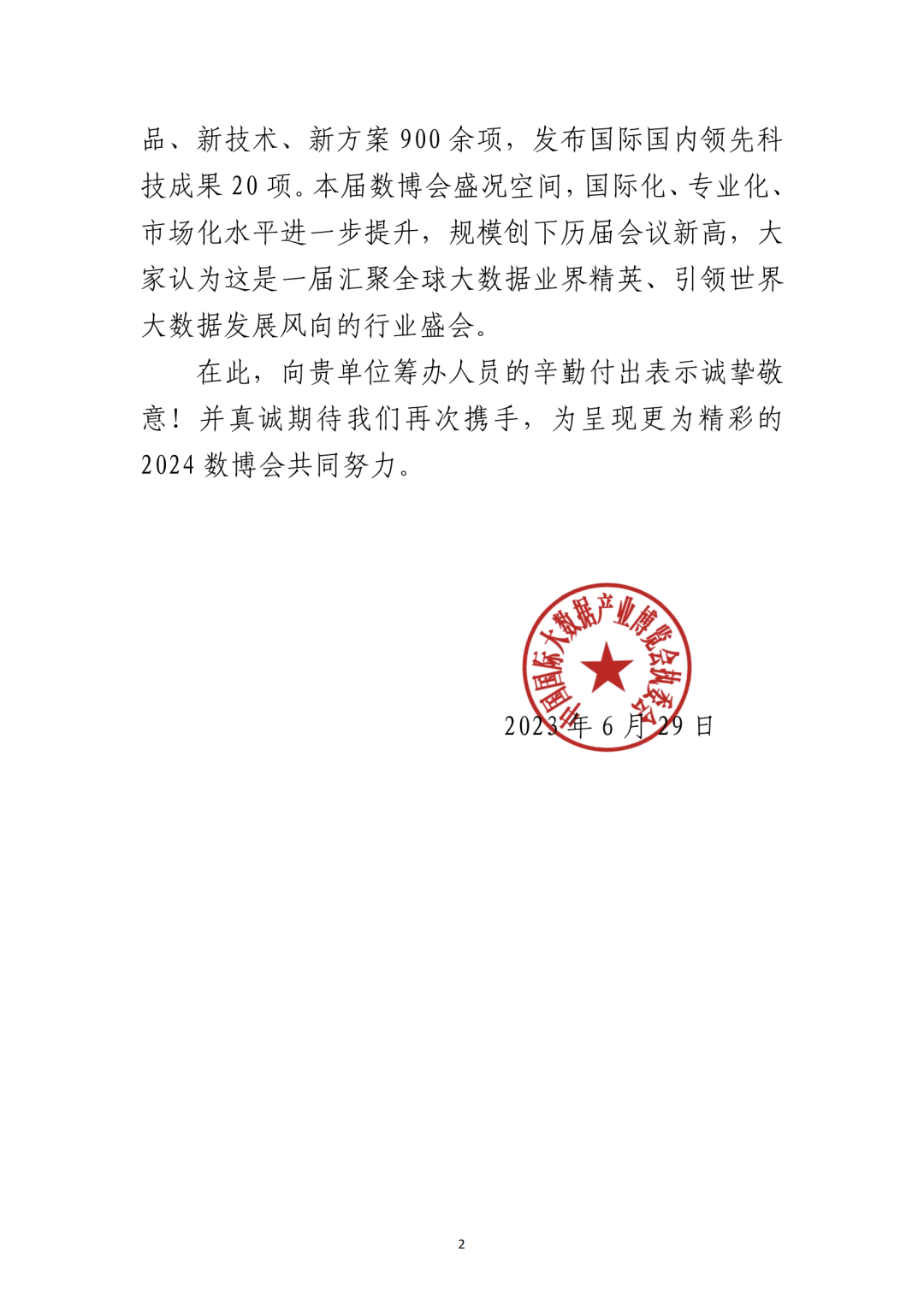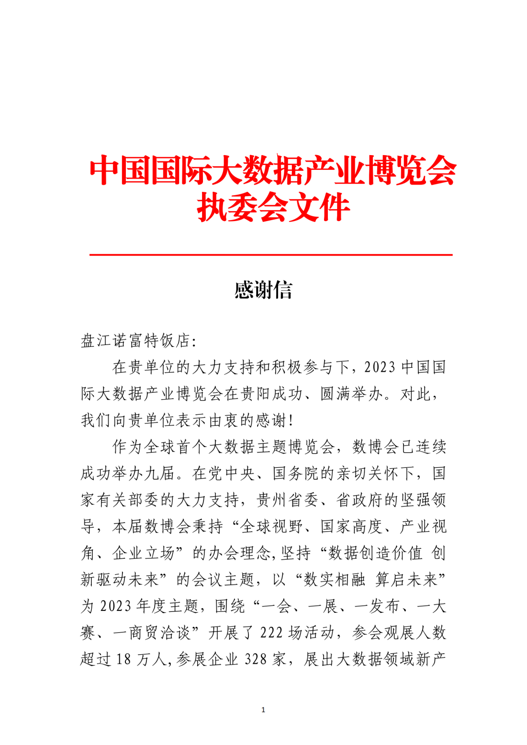 6月29日,中国国际大数据产业博览会组委会给盘江饭店发来感谢信,对饭店在本届数博会期间提供的优质服务和付出的辛苦努力致以诚挚的感谢。感谢信写道,在贵单位的大力支持和积极参与下,2023中国国际大数据产业博览会在贵阳成功、圆满举办。对此,我们向贵单位表示由衷的感谢!向贵单位筹办人员的辛勤付出表示诚挚敬意!并真诚期待我们再次携手,为呈现更为精彩的2024数博会共同努力。据了解,本次数博会是自2020年以来贵阳市举办规模最大的一次国际盛会。会议召开期间,盘江饭店积极对接数博会执委会,配合贵阳市公安、消防、文旅、卫监、外事、特检所等单位部门,扎实做好安全保卫、房务安排、餐食保障、秩序引导、外语翻译等服务保障工作,为参会代表团营造了安全、舒适、温馨的入住体验,高质量完成了接待任务,受到入住人员的赞许,对外展示了贵州能源集团良好的窗口形象。(游云禄)