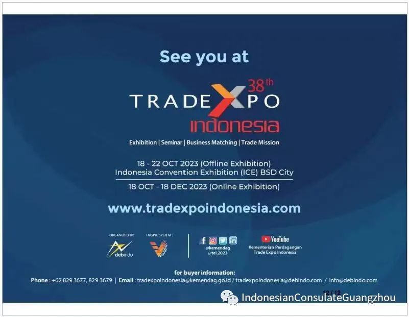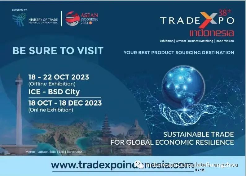 印度尼西亚共和国驻广州总领事馆诚挚邀请您参加于2023年10月18日-22日在印度尼西亚丹格朗市BSD印尼会展中心(ICE)举办的第38届印尼贸易博览会。
