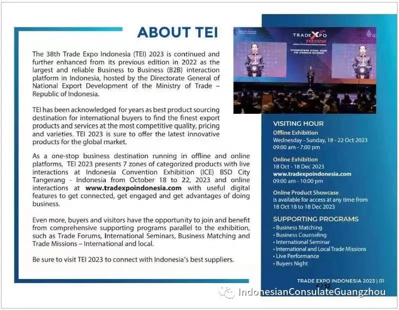 2023年第 38 届印度尼西亚贸易博览会(TEI) 在2022 年上届展会的基础上继续举办并进一步增强,是印度尼西亚最大、最可靠的企业对企业 (B2B) 互动平台,由印度尼西亚共和国贸易部国家出口发展总局主办。TEI 多年来一直被公认为国际买家的最佳产品采购目的地,以最具竞争力的质量、价格和种类提供最好的出口产品和服务。2023印尼贸易博览会必将为全球市场提供最新的创新产品。作为线上线下平台一站式商贸盛会,2023印尼贸易博览会于2023年10月18日至22日在印尼丹格朗印尼会展中心(ICE)展示7个分类产品专区并进行现场互动,更重要的是,买家和参观者有机会参加与展会同时举行的系列活动并从中受益,例如贸易论坛、国际研讨会、商业配对和国际和本地贸易代表团。