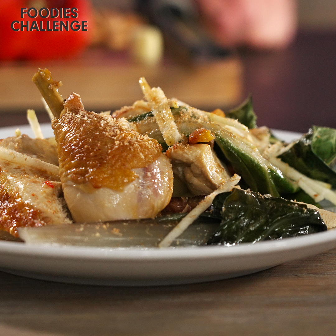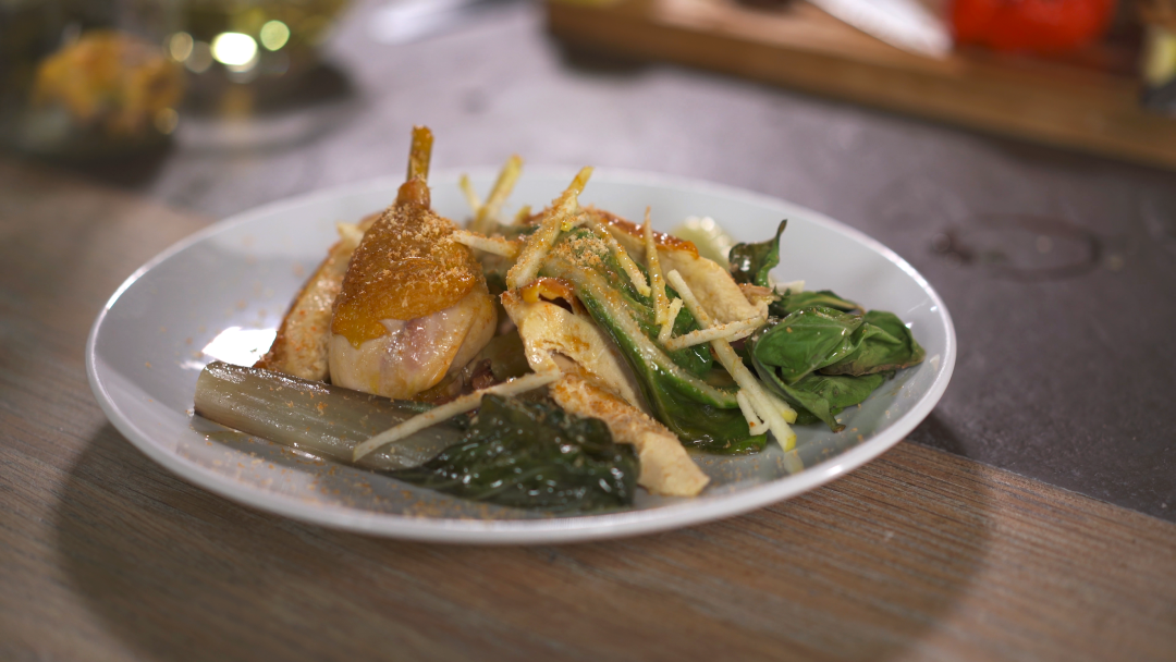 创作的法式美食慕斯卡德葡萄酒烩散养鸡。
