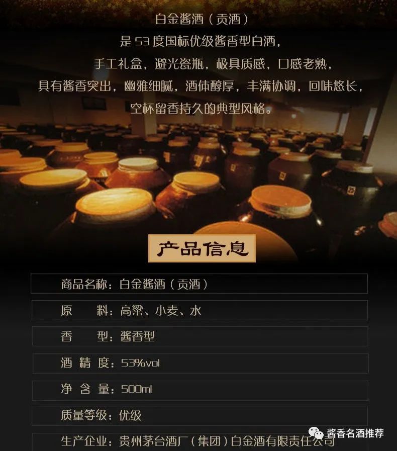 白金贡酒是茅台酒的高端产品,是白金酒厂的招牌产品之一,这款酒的口感非常独特,具有浓郁的果香和清新的花香,同时还带有一些微妙的酒精味道。