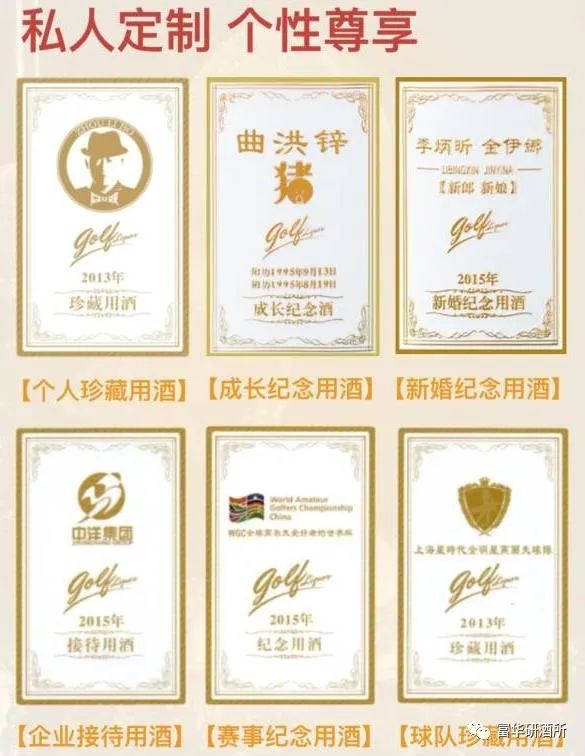 高尔夫酒特别为高尔夫球爱好者等社会精英人士及企业推出了个性化定制用酒服务:一杆进洞个性化定制酒、冠军个性化定制酒、董事长珍藏定制酒、会员生日纪念个性化定制酒、企业贵宾接待定制酒、高尔夫球赛事定制酒和婚宴纪念个性化定制酒等多种个性化定制酒服务。专属定制的高尔夫酒更有纪念意义、更具收藏价值、更上档次、更显尊贵。