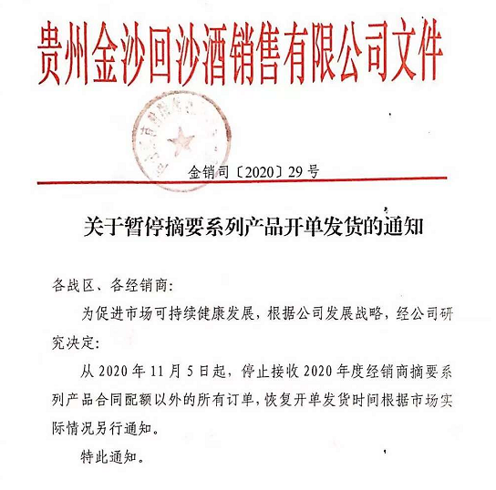 11月5日,贵州金沙回沙酒销售有限公司发布《关于暂停摘要系列产品开单发货的通知》的文件。文件显示:从2020年11月5日起,停止接收2020年度经销商摘要系列产品合同配额以外的所有订单,恢复开单发货时间根据市场实际情况另行通知。