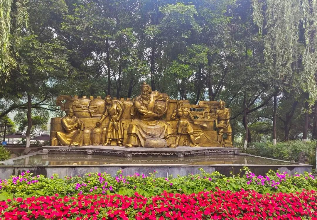 坐落于茅台酒文化城中的《源远流长》雕塑,也是茅台集团的标志之一,展现的是酱香酒独特的核心酿造工艺流程。