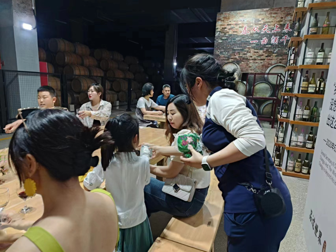 同学们为游客提供品酒服务。大家结合在校所学的1+x葡萄酒推荐与侍酒服务职业技能等级考试的相关知识,按照专业流程和标准为游客热情提供服务,并耐心向游客讲解所选葡萄酒的产地、葡萄品种、酒庄等相关信息,品酒结束后,及时清理酒杯,确保游客最佳的品尝体验。