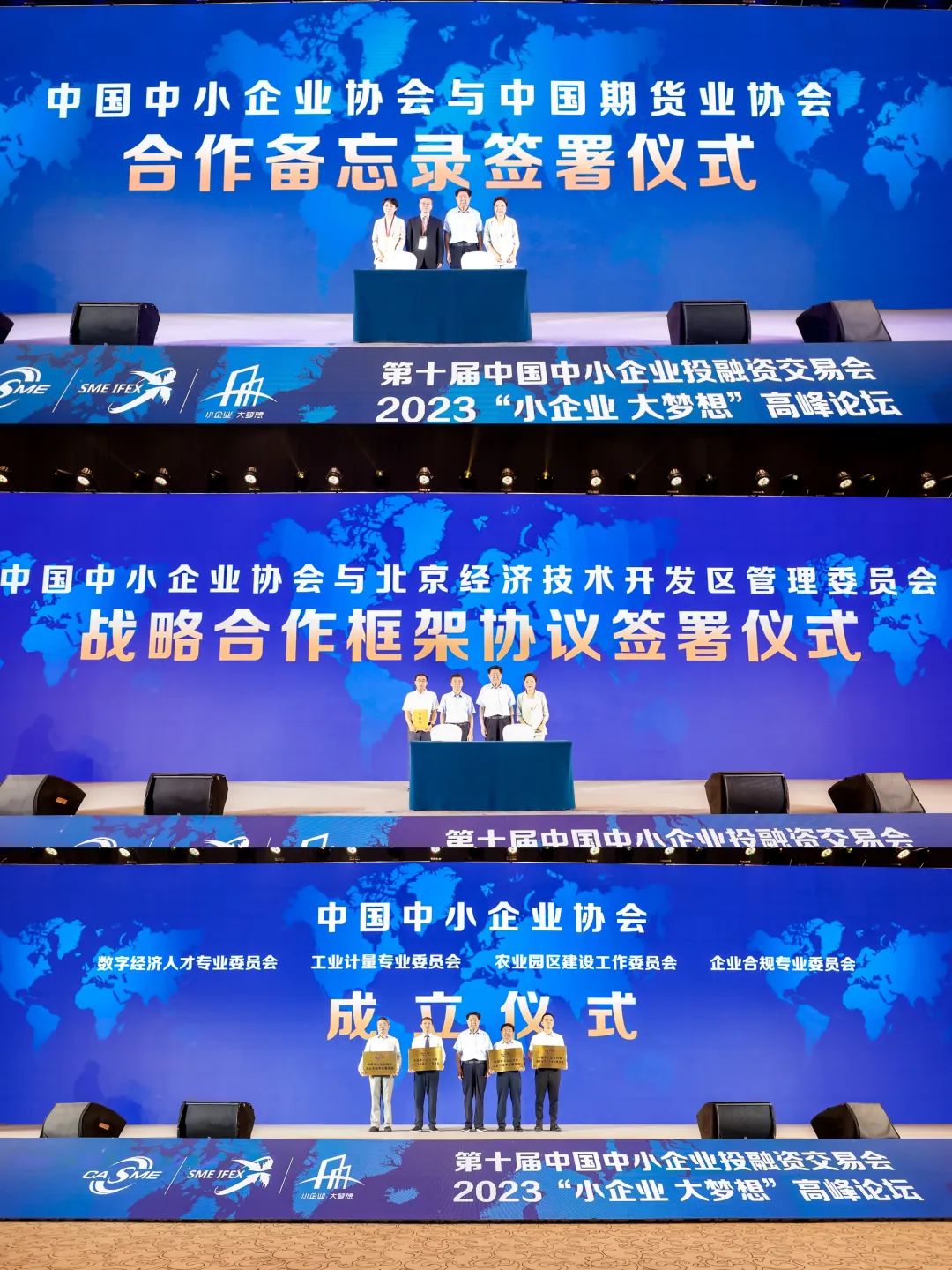 马彬常务副会长代表中国中小企业协会分别与中国期货业协会和北京经济技术开发区管理委员会签署战略合作协议。会上发布了北京经济技术开发区政府引导基金、2022年度期货经营机构服务实体经济优秀案例和2022年金融服务专精特新中小企业典型案例。中国中小企业协会李子彬会长为新成立的数字经济人才专业委员会、工业计量专业委员会、农业园区建设工作委员会和合规专业委员会授牌。