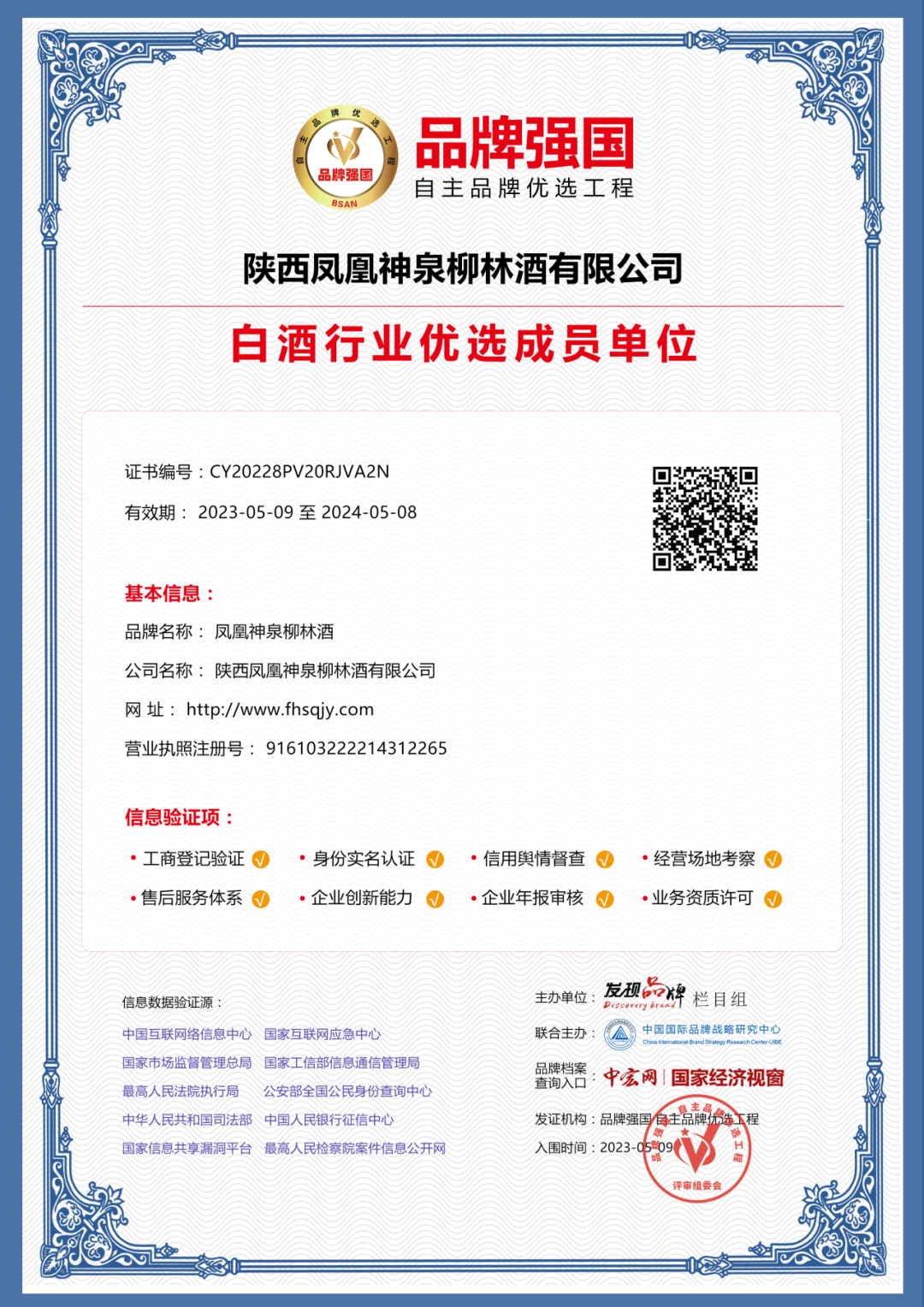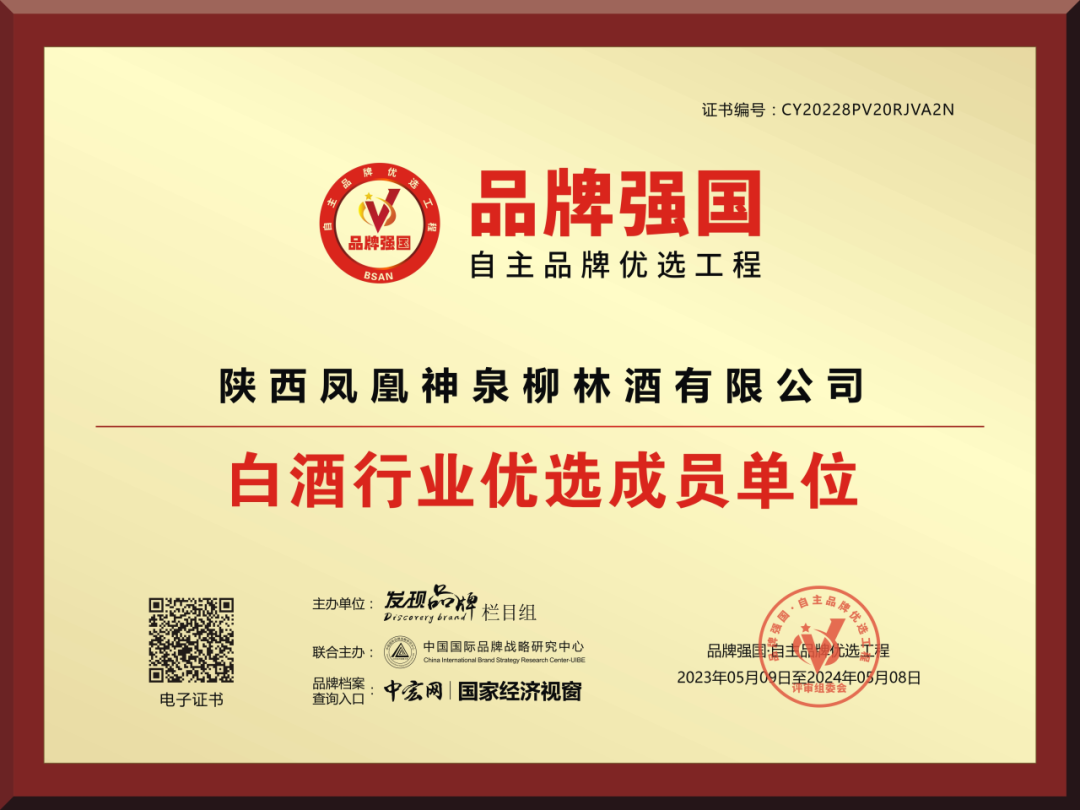 近日,陕西凤凰神泉柳林酒有限公司经过资质审核、舆情监控等层层筛选,成功入选为品牌强国优选工程白酒行业优选成员单位,企业信息录入品牌强国优选工程数据库,在国家级平台向公众展示品牌形象。