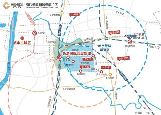 长沙国际会展新城是长沙市东南方向的“门户”,其位置东至黄兴大道,西起浏阳河(含磨盘洲),南至湘府东路(以南500米),北达浏阳河-长沙大道,开发面积为30平方公里;其中,中国(湖南)自贸试验区长沙片区会展区块面积9.84平方公里。