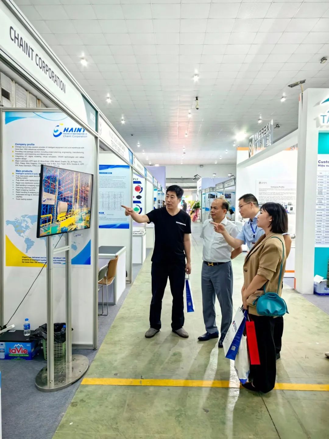 公司营销部部长刘少华带队,精心布置现场展位,TKC、HKB、MIZA等多家越南本地造纸企业驻足参观,众多客户纷纷表示出对长泰智能化系统的浓厚兴趣,希望用智能化系统、数字化平台替代人工重复性、高强度劳动,降低运营成本,提高生产效率。近年,中轻长泰紧跟客户脚步,先后创新研发了面向制浆造纸行业的塞头自动置入、纸垛自动在线处理、自动放置顶盖板等一系列智能化系统和整厂智慧控制系统,以及基于物联网的智能装备云平台、智能视频分析平台等数字化平台,为客户实现数字化、智能化转型升级保驾护航,让客户更安心。