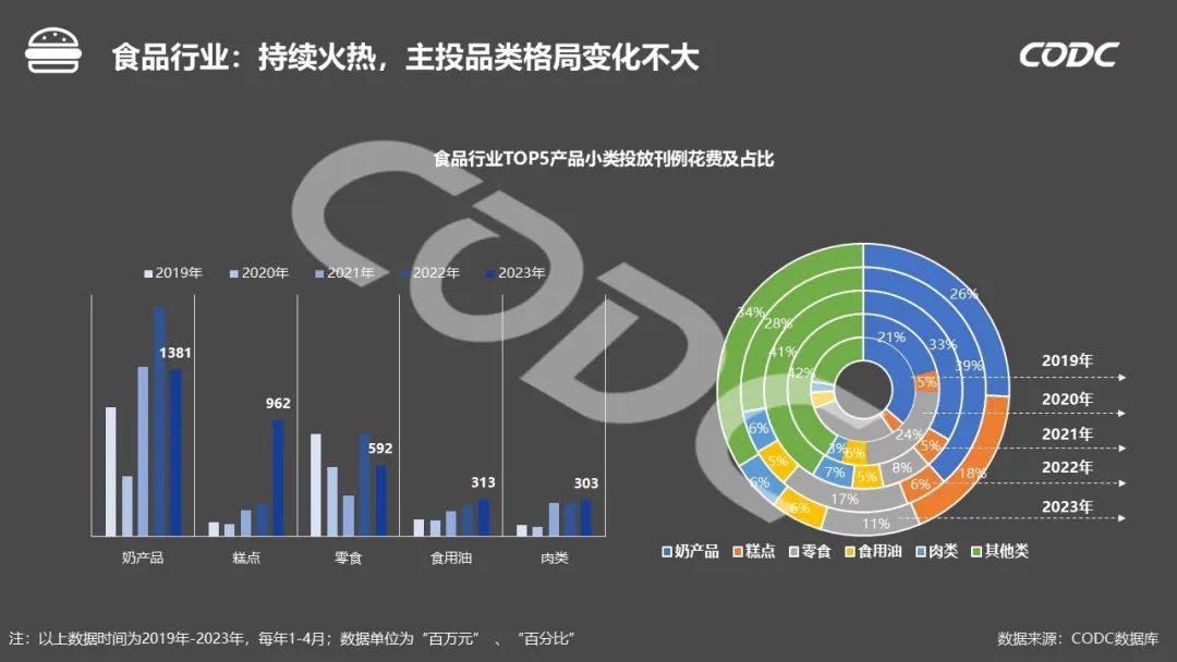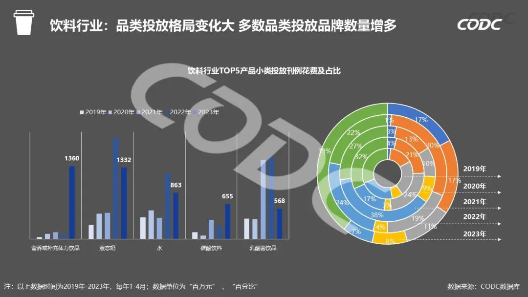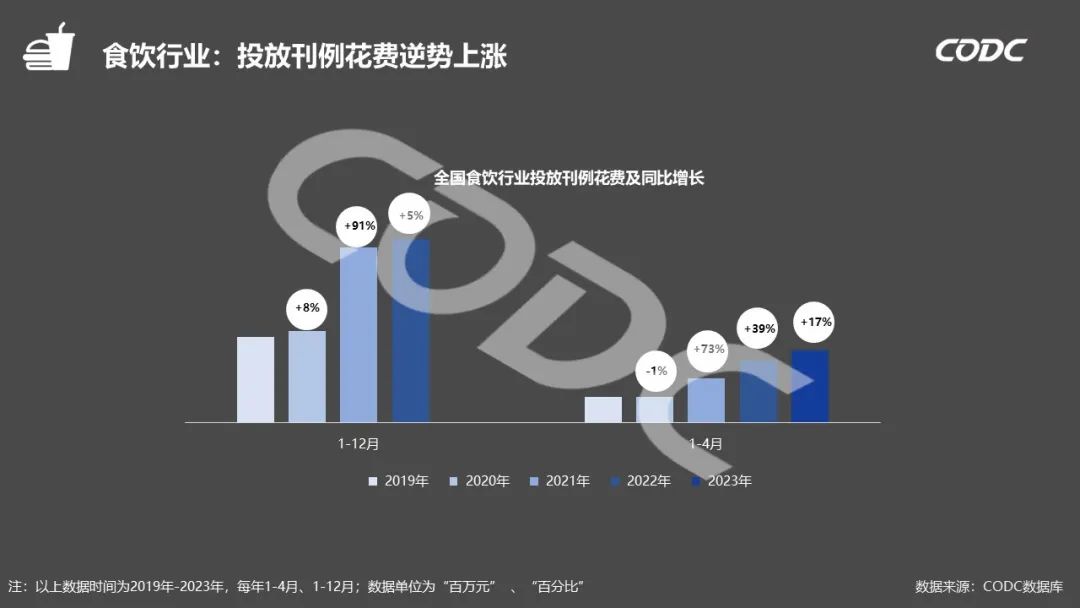 根据CODC数据显示, 2023年1-4月,食品饮料行业投放刊例花费达131.93亿元,同比增长17%,与2022年同期增长39%相比,增速有所放缓,但与其他行业相比,速度惊人。