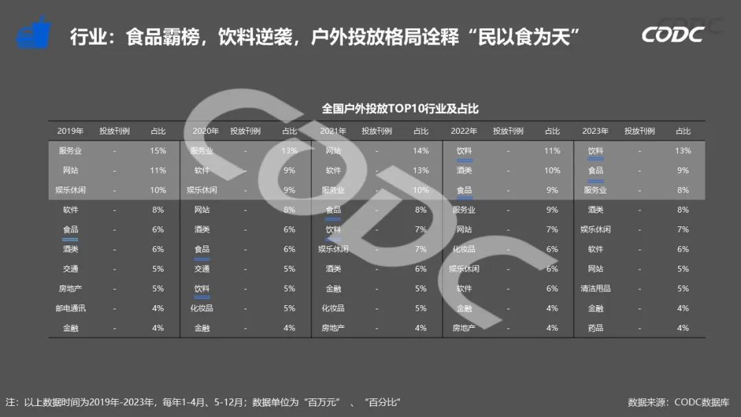 历年来,户外广告主投行业格局变化较大,这与消费者需求变化息息相关。疫情前,主投行业以服务业、网站、娱乐休闲、软件等投放为主,疫情期间服务业娱乐休闲受挫,“双减” 政策的实施以及互联网寒冬出现,让软件及网站行业投放形势急转直下,在此期间,作为人们生活刚需的食品饮料行业始终处于波动上升状态。2023年1-4月,进入细分领域的饮料行业市场竞争进入白热化,投放占比也从2019年的4%上升至13%,一跃成为投放行业的首位。与此同时,食品的投放份额也从占比6%上升至9%,成为仅次于饮料的投放行业。