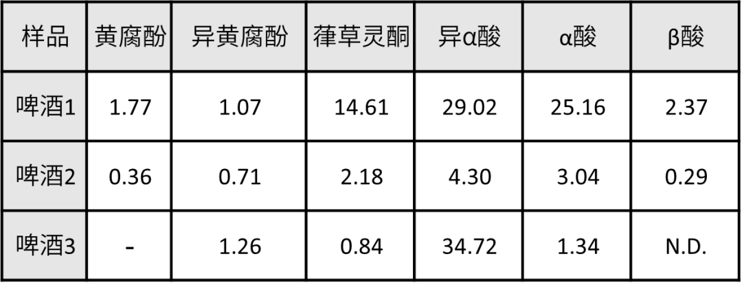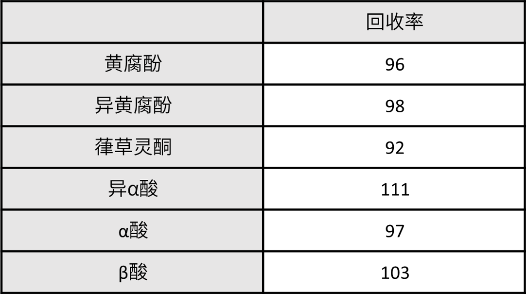建立了6种风味成分的校准曲线,r2均大于0.999,浓度范围内线性关系良好(浓度是相关化合物顺式和反式异构体的总和);同时对市售啤酒1进行了重复性和加标回收率测试,结果显示该方法重现性和加标回收率良好;最后,对三种市售啤酒各组分进行了定量分析,结果显示不同啤酒之间风味物质存在一定的差异。
