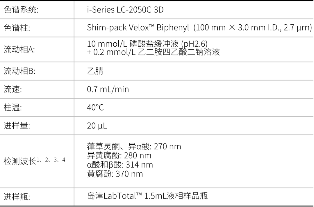 样本处理方法参考欧洲啤酒酿造协会9.47(European Brewery Convention, EBC ANALYTICA, 9.47),本实验使用岛津一体型LC i-Series进行分析。i-Series是岛津新一代一体型液相色谱系统,具备性能卓越、智能高效和稳定可靠的特点。
