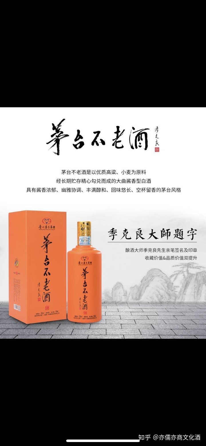茅台不老酒是茅台酒系列产品。与茅台酒同宗同源,一脉相承。他是以优质高粱、小麦为原料,按贵州茅台酒工艺生产,经长期贮存精心勾兑而成的大曲酱香型白酒。具有酱香浓郁、幽雅协调、丰满醇和、回味悠长、空杯留香的茅台风格。