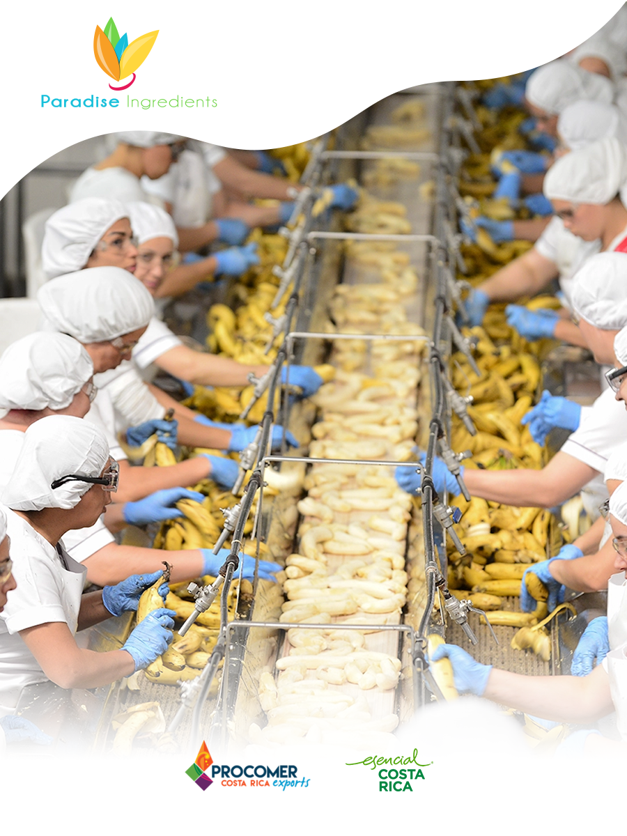 Paradise Ingredients 是一家致力于香蕉产品的生产和出口的哥斯达黎加企业。40 多年的食品行业市场创新经验使其超30多种优质香蕉产品在市场中得以应用并广受好评。其公司年出口超过 2,100 整箱,符合最高国际质量标准。