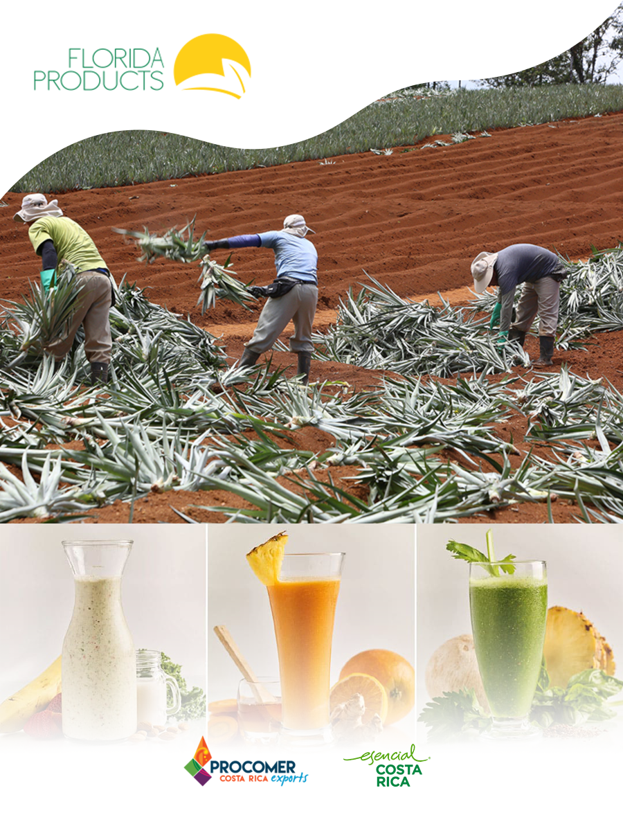 自1987年以来,Florida Products致力于食品和饮料行业出口。其产品包括优质果汁、非浓缩还原汁(NFC)、浓缩果汁(PJC)等。他们是哥斯达黎加当地领先的NFC菠萝汁出口公司之一,产品直接来自于菠萝农场的金菠萝。