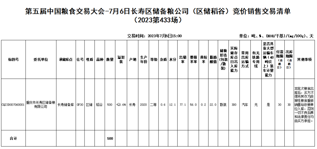 受重庆市长寿区储备粮有限公司委托,重庆市粮油批发市场有限责任公司(即国家粮食重庆交易中心,以下简称“批发市场”)定于2023年7月6日15:00举办长寿区储备粮公司(区储稻谷)竞价销售交易会,现将有关事项公告如下: