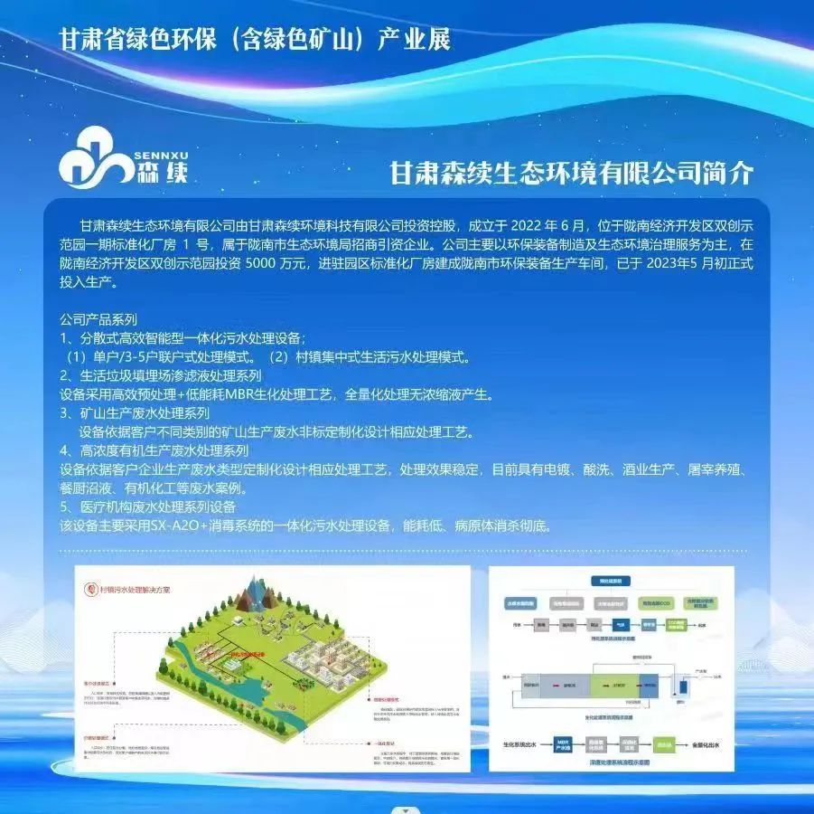 本次展览以推进我省绿色环保(含绿色矿山)产业链工作为目的,围绕生态环境治理新要求、新旧动能转换新战略、环保产业市场新方向、减污降碳协同增效新目标,聚力打造绿色生态环保(含绿色矿山)产业供需对接、技术交流合作平台,推动绿色发展实现更大进展,主办方安排展位30个,展会期间,甘肃森续生态环境有限公司向与会嘉宾、客商和兰大师生展示了单位形象,介绍了企业生产经营、产品及服务等内容,现场演示了公司一体化污水处理设备。同时与业内同行和专家深入进行技术交流学习,对提高公司产品质量起到了积极的促进作用。