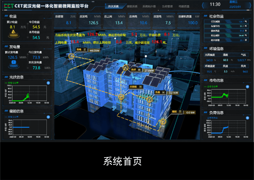 基于源网荷储深度协同核心理念而设计,全方位展示整个光伏电站的运行情况,实时监测和管理市电供电、光伏发电、储能充放电、充电桩运行、负荷用电及光伏电站运行节能减排等信息。