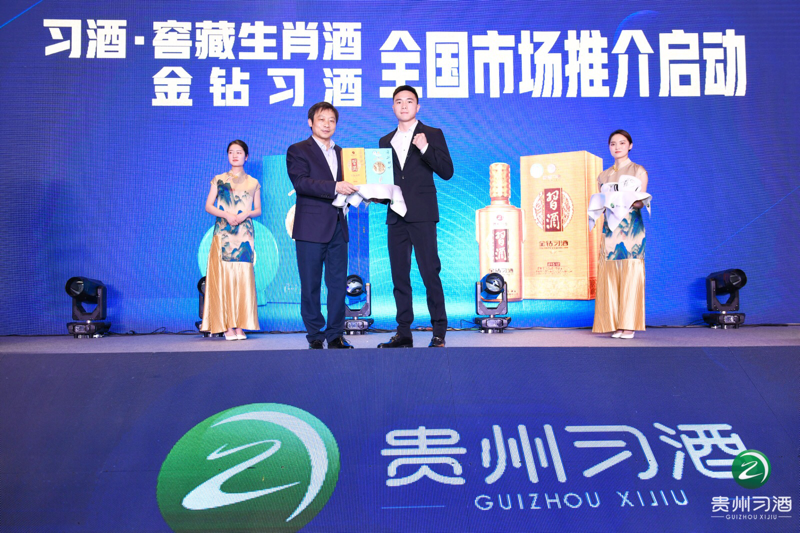 活动现场,茅台集团总经理助理、习酒公司党委副书记、副董事长、总经理涂华彬与中国首位男子五星世界拳王、WBA羽量级世界拳王徐灿共同登台揭开了习酒·窖藏生肖酒(己亥猪年)与金钻习酒的神秘面纱。