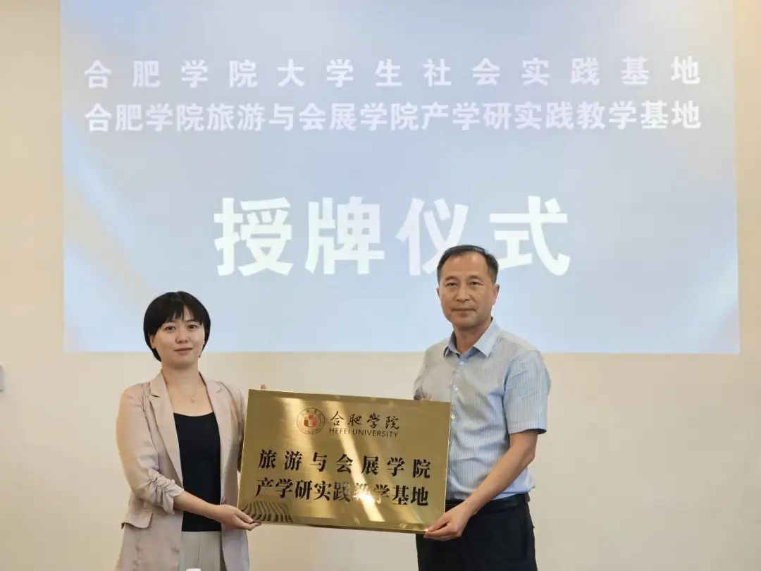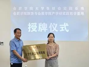 然后集中进行了授牌仪式,李妍妍为合肥学院大学生社会实践基地授牌,宋玉军为合肥学院旅游与会展学院产学研实践教学基地授牌。