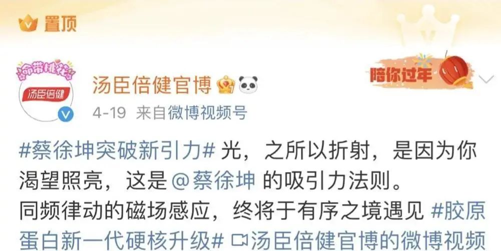 除了燕京啤酒,汤臣倍健也置顶蔡徐坤广告