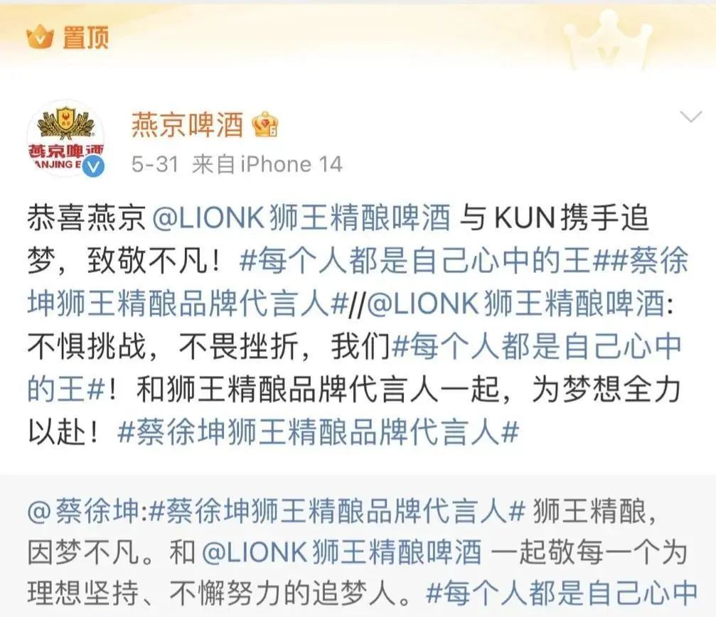 燕京啤酒公司高调置顶蔡徐坤官方账号也引发了一些质疑和争议。