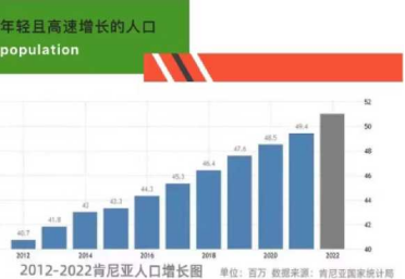 据统计,2022年肯尼亚总人口将突破5400 万,人口结构较年轻,平均年龄仅20.7岁, 肯政府重视发展教育事业,成人识字率近 90%,在非洲国家中名列前茅。2022年1 月,肯尼亚有2335万互联网用户,互联网普 及率为42%,年增长率7.4%,高于非洲平均 值,发展潜力巨大。肯尼亚有1175万社交媒 体用户,社媒渗透率为21.1%。