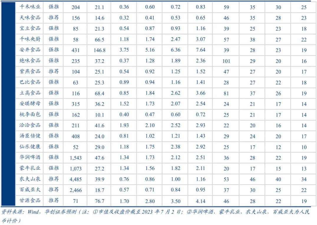 桃李面包:经营仍然承压,H2改善可期。Q2整体复苏势头较弱,同时去年同期基数偏高,预计公司Q2收入仍有压力。其中,传统优势市场东北表现相对偏弱,华北、华中地区恢复较好,且主食类面包相较休闲类蛋糕表现更优。成本端来看,公司5-6月开启新一轮锁价期,预计油脂类分品类会下降,糖、包材亦略有改善,而面粉维持高位。展望下半年,考虑基数逐渐走低,同时成本改善有望部分兑现,预计H2表现好于H1。