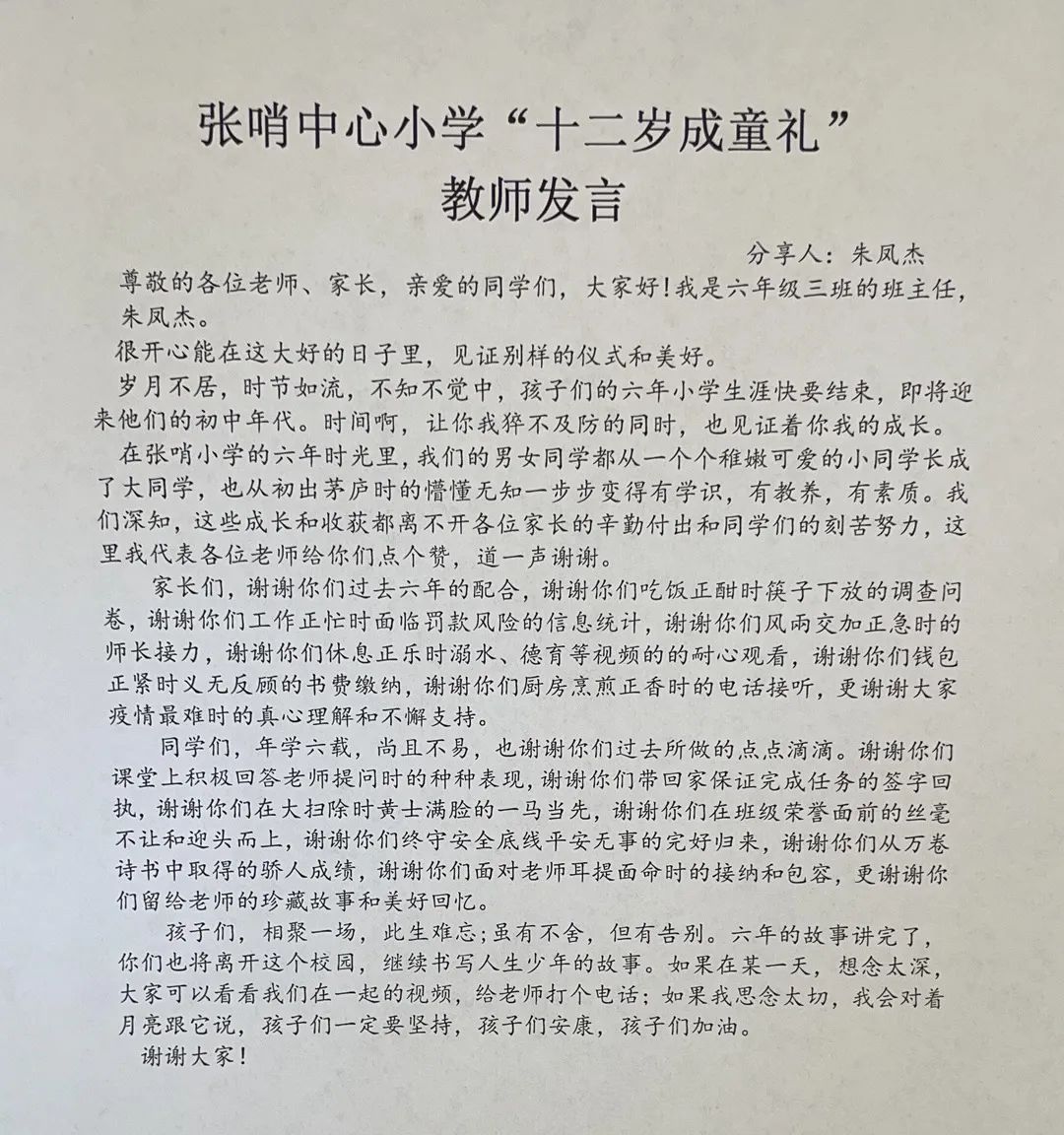 身为张哨中心小学少先队大队辅导员和六年级三班班主任的朱凤杰老师把陪伴孩子们的真实感受分享给了大家,字字感人,句句真情。