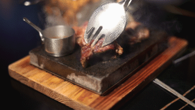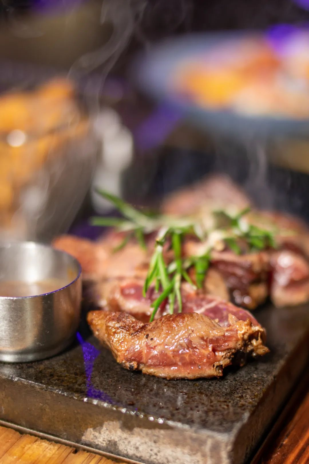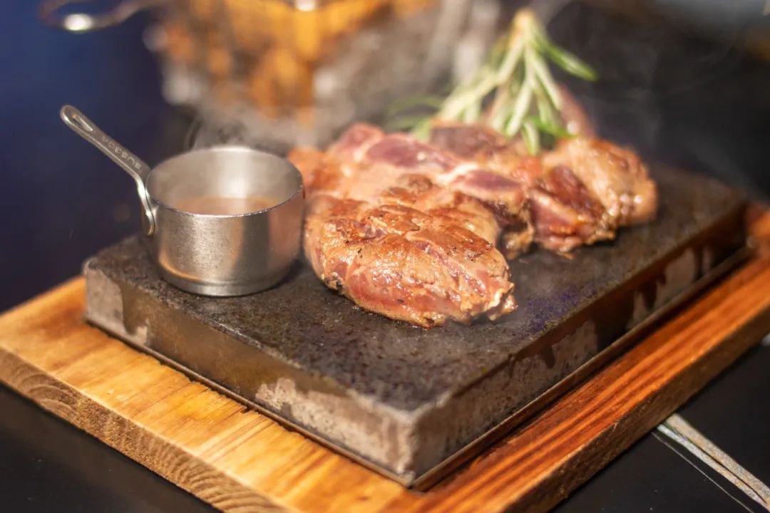 焦黄色的外表内纹理清晰,带些许粉嫩色泽,火山石高温炙烧,刚上桌还滋滋作响~