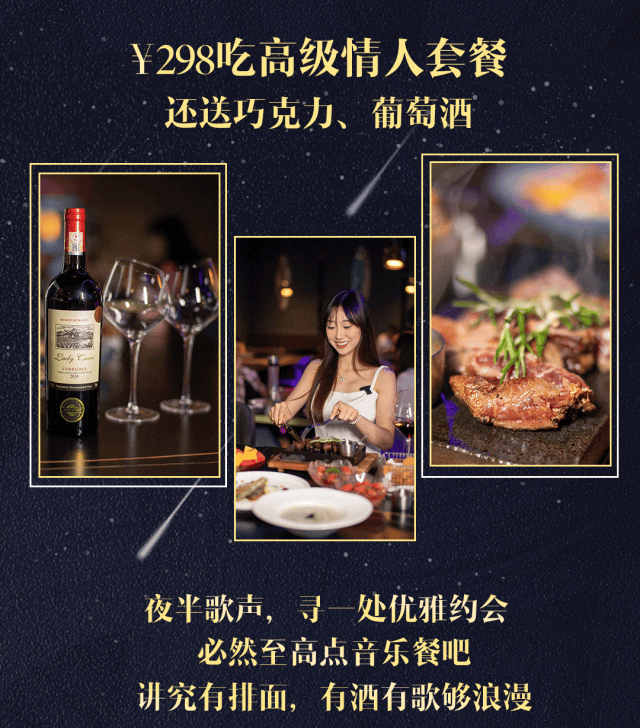 现在推出情人双人套餐仅需298元,招牌扒类、甜品、美酒全都有!还送巧克力礼盒~